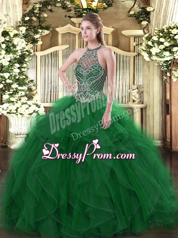 Neckline : Halter topShown Color : GreenSilhouette : Ball GownsSleeve Length : sleevelessHemline : floor lengthBack Detail : Lace upFabric : OrganzaEmbellishment : Beading,RufflesOccasion : Sweet 16,QuinceaneraSeason : Spring,Summer,Fall,Winter