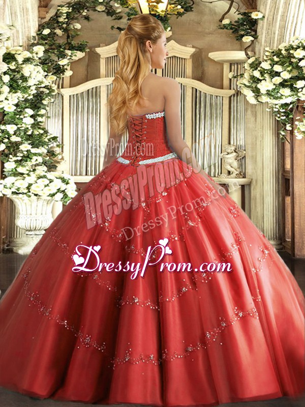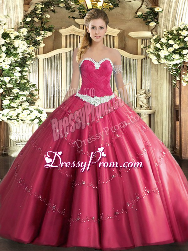 Neckline : SweetheartShown Color : Hot PinkSilhouette : Ball GownsSleeve Length : sleevelessHemline : floor lengthBack Detail : Lace upFabric : TulleEmbellishment : AppliquesOccasion : Military Ball,Sweet 16,QuinceaneraSeason : Spring,Summer,Fall,Winter