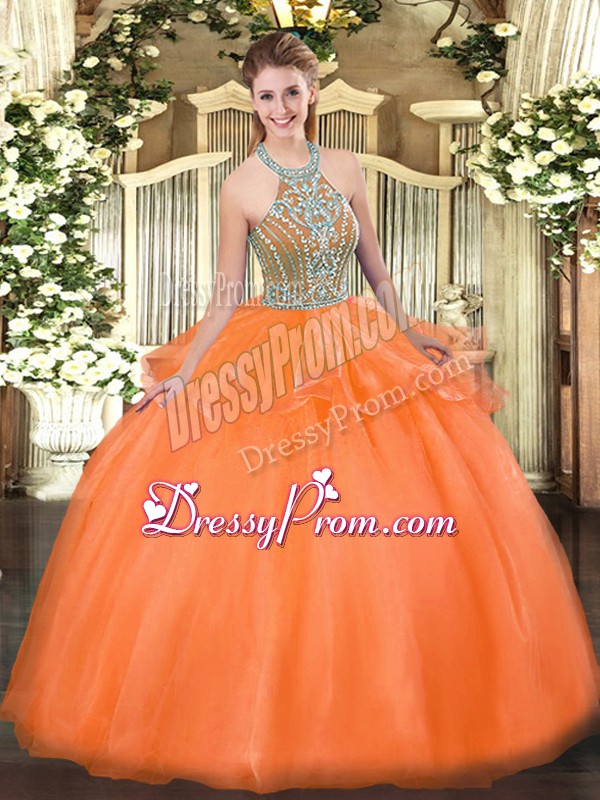 Neckline : Halter topShown Color : Orange RedSilhouette : Ball GownsSleeve Length : sleevelessHemline : floor lengthBack Detail : Lace upFabric : TulleEmbellishment : Beading,RufflesOccasion : Military Ball,Sweet 16,QuinceaneraSeason : Spring,Summer,Fall,Winter