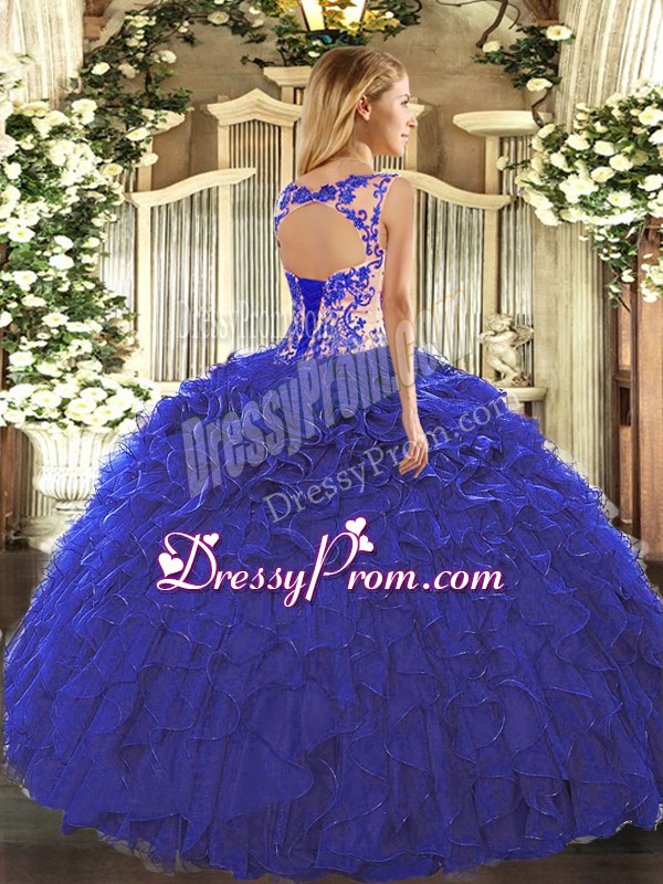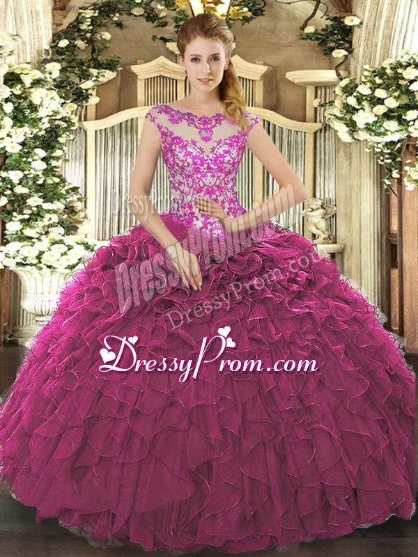 Neckline : ScoopShown Color : FuchsiaSilhouette : Ball GownsSleeve Length : cap sleevesHemline : floor lengthBack Detail : Lace upFabric : OrganzaEmbellishment : Beading,Appliques,RufflesOccasion : Sweet 16,QuinceaneraSeason : Spring,Summer,Fall,Winter