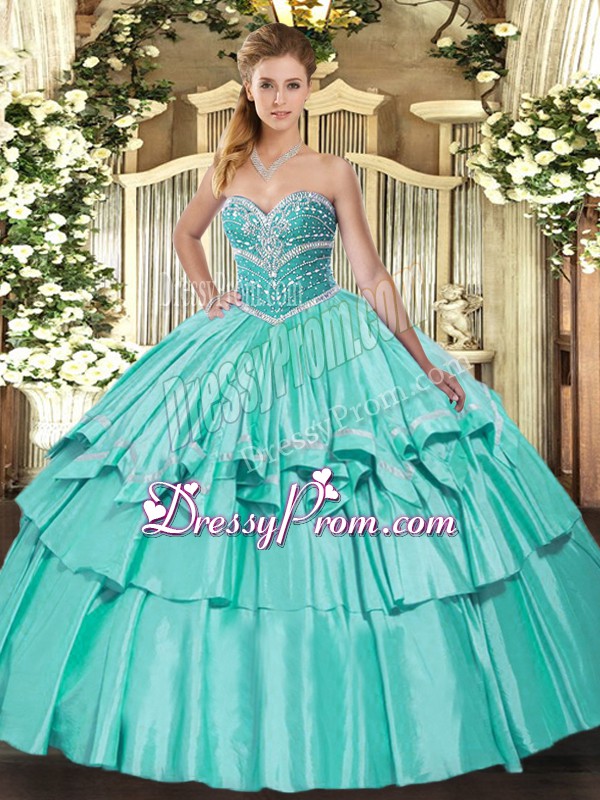 Neckline : SweetheartShown Color : Apple GreenSilhouette : Ball GownsSleeve Length : sleevelessHemline : floor lengthBack Detail : Lace upFabric : Organza,TaffetaEmbellishment : Beading,Ruffled LayersOccasion : Military Ball,Sweet 16,QuinceaneraSeason : Spring,Summer,Fall,Winter