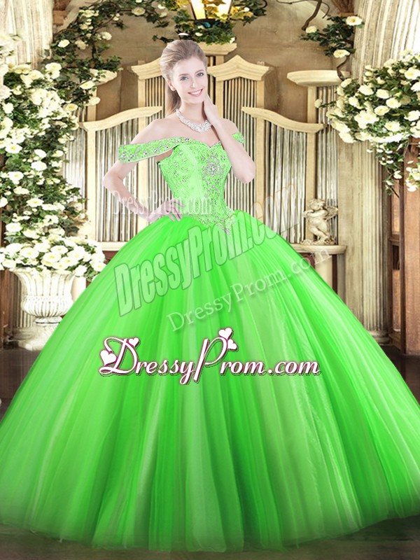 Neckline : Off the shoulder Shown Color : Green Silhouette : Ball Gowns Sleeve Length : sleeveless Hemline : floor length Back Detail : Lace up Fabric : Tulle Embellishment : Beading Occasion : Military Ball,Sweet 16,Quinceanera Season : Spring,Summer,Fall,Winter