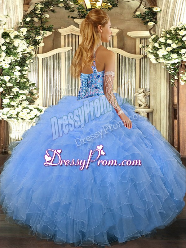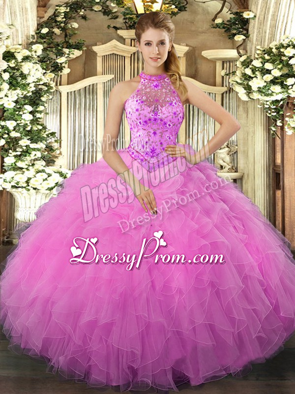 Neckline : Halter topShown Color : Rose Pink Silhouette : Ball GownsSleeve Length : sleevelessHemline : floor lengthBack Detail : Lace upFabric : OrganzaEmbellishment : Beading,RufflesOccasion : Sweet 16,QuinceaneraSeason : Spring,Summer,Fall,Winter