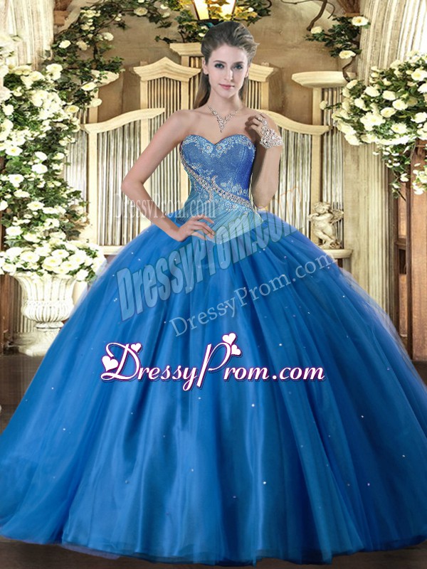 Beauteous Floor Length Lace Up 15th Birthday Dress Blue for Military Ball and Sweet 16 and Quinceanera with Beading