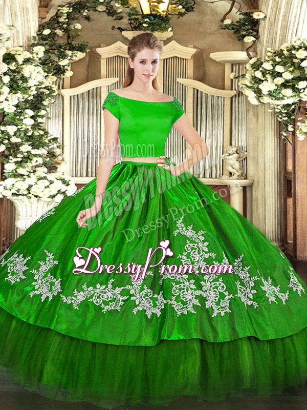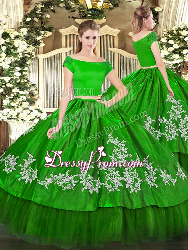 Neckline : Off the shoulder Shown Color : Green Silhouette : Two Pieces Sleeve Length : short sleeves Hemline : floor length Back Detail : Zipper Fabric : Organza,Taffeta Embellishment : Embroidery Occasion : Military Ball,Sweet 16,Quinceanera Season : Spring,Summer,Fall,Winter