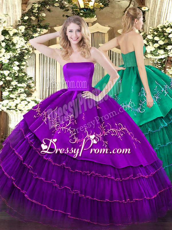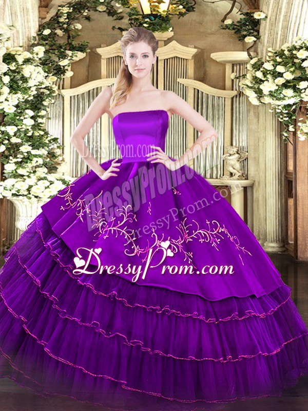 Neckline : StraplessShown Color : PurpleSilhouette : Ball GownsSleeve Length : sleevelessHemline : floor lengthBack Detail : ZipperFabric : Organza,TaffetaEmbellishment : Embroidery,Ruffled LayersOccasion : Military Ball,Sweet 16,QuinceaneraSeason : Spring,Summer,Fall,Winter