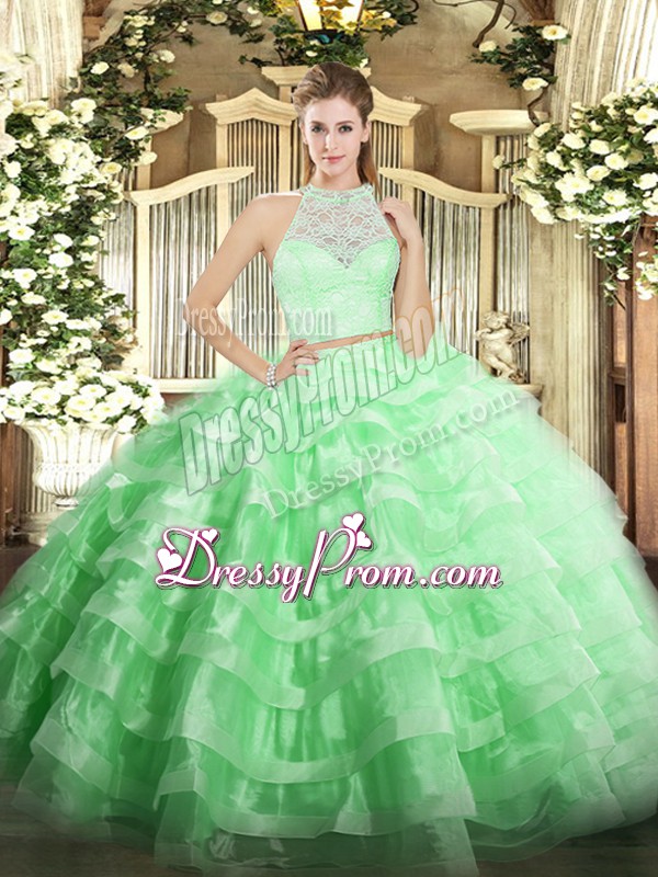 Neckline : ScoopShown Color : Apple GreenSilhouette : Two PiecesSleeve Length : sleevelessHemline : floor lengthBack Detail : ZipperFabric : TulleEmbellishment : Lace,Ruffled LayersOccasion : Military Ball,Sweet 16,QuinceaneraSeason : Spring,Summer,Fall,Winter