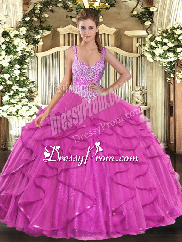 Neckline : StrapsShown Color : FuchsiaSilhouette : Ball GownsSleeve Length : sleevelessHemline : floor lengthBack Detail : Lace upFabric : TulleEmbellishment : Beading,RufflesOccasion : Military Ball,Sweet 16,QuinceaneraSeason : Spring,Summer,Fall,Winter