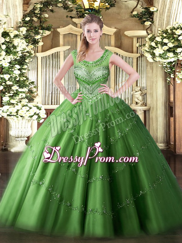 Neckline : ScoopShown Color : GreenSilhouette : Ball GownsSleeve Length : sleevelessHemline : floor lengthBack Detail : Lace upFabric : TulleEmbellishment : Beading,AppliquesOccasion : Sweet 16,QuinceaneraSeason : Spring,Summer,Fall,Winter