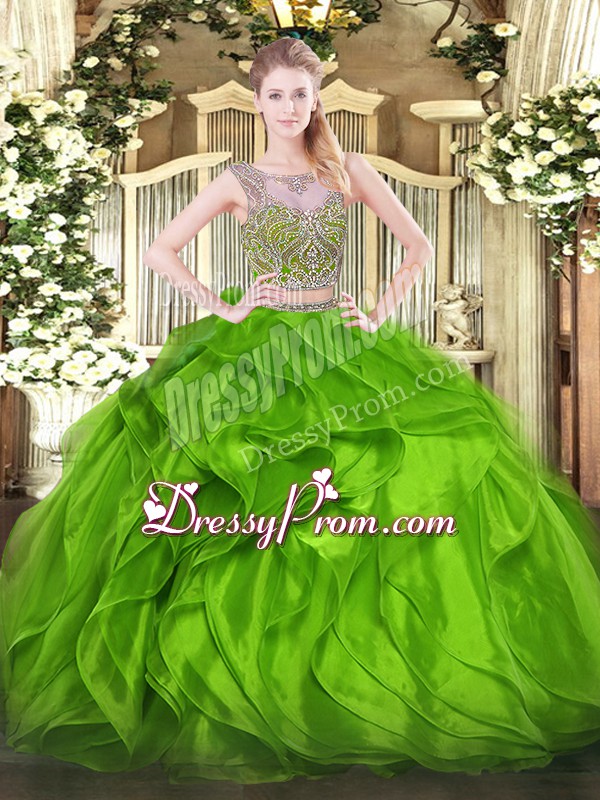 Neckline : ScoopShown Color : GreenSilhouette : Two PiecesSleeve Length : sleevelessHemline : floor lengthBack Detail : Lace upFabric : OrganzaEmbellishment : Beading,RufflesOccasion : Military Ball,Sweet 16,QuinceaneraSeason : Spring,Summer,Fall,Winter