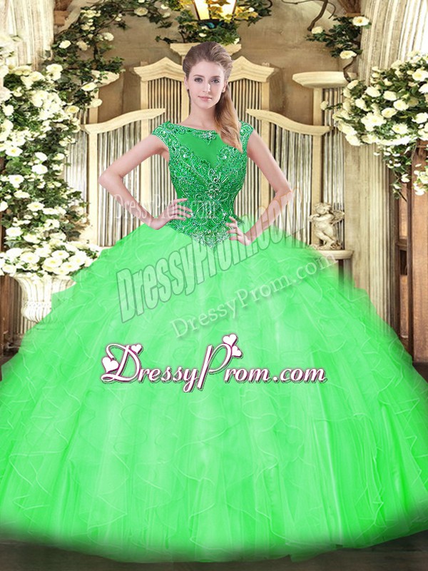 Neckline : ScoopShown Color : Spring GreenSilhouette : Ball GownsSleeve Length : sleevelessHemline : floor lengthBack Detail : ZipperFabric : TulleEmbellishment : Beading,RufflesOccasion : Sweet 16,QuinceaneraSeason : Spring,Summer,Fall,Winter