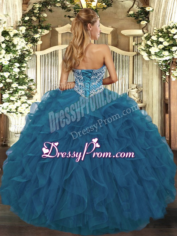 Neckline : SweetheartShown Color : Teal Silhouette : Ball GownsSleeve Length : sleevelessHemline : floor lengthBack Detail : Lace upFabric : TulleEmbellishment : Beading,Ruffled LayersOccasion : Military Ball,Sweet 16,QuinceaneraSeason : Spring,Summer,Fall,Winter