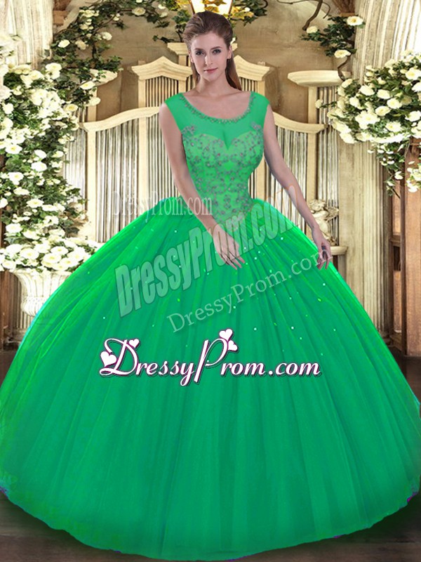 Neckline : ScoopShown Color : GreenSilhouette : Ball GownsSleeve Length : sleevelessHemline : floor lengthBack Detail : BacklessFabric : TulleEmbellishment : BeadingOccasion : Military Ball,Sweet 16,QuinceaneraSeason : Spring,Summer,Fall,Winter