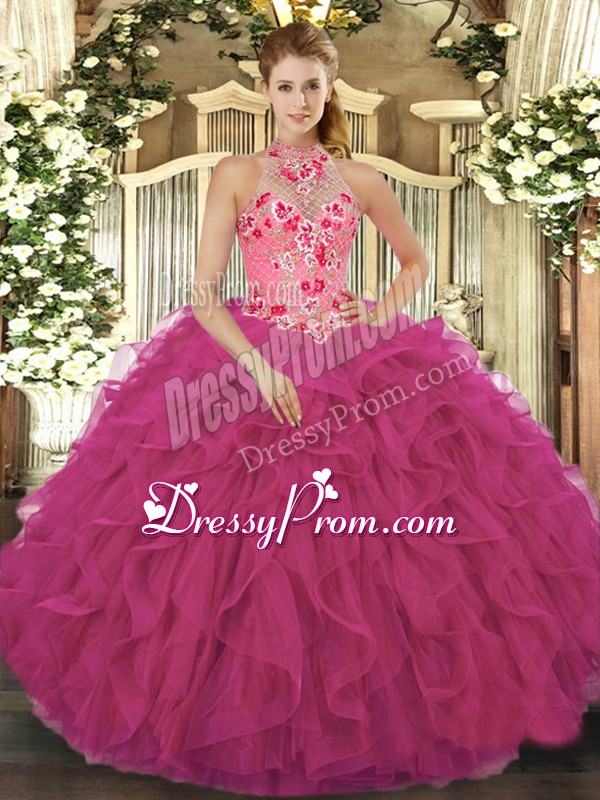 Neckline : Halter topShown Color : Hot PinkSilhouette : Ball GownsSleeve Length : sleevelessHemline : floor lengthBack Detail : Lace upFabric : OrganzaEmbellishment : Beading,Embroidery,RufflesOccasion : Military Ball,Sweet 16,QuinceaneraSeason : Spring,Summer,Fall,Winter