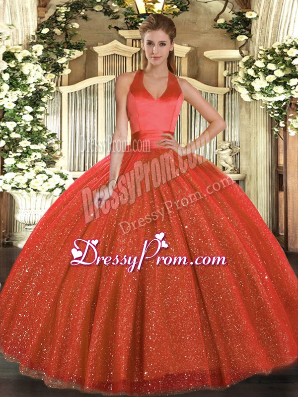 Neckline : Halter topShown Color : Rust RedSilhouette : Ball GownsSleeve Length : sleevelessHemline : floor lengthBack Detail : Lace upFabric : TulleEmbellishment : SequinsOccasion : Military Ball,Sweet 16,QuinceaneraSeason : Spring,Summer,Fall,Winter