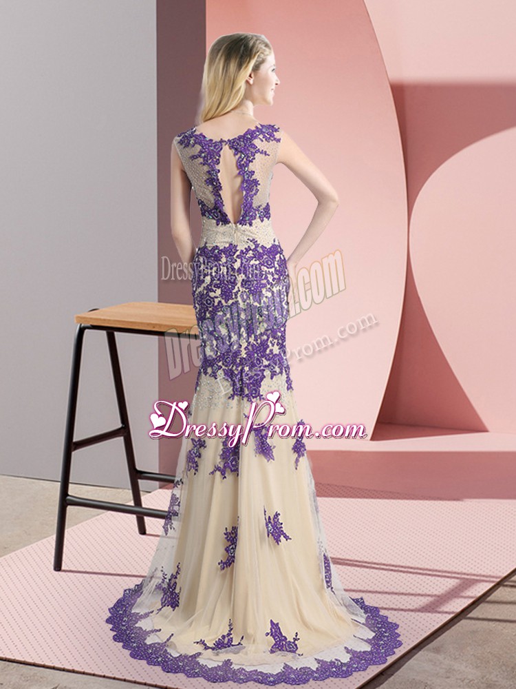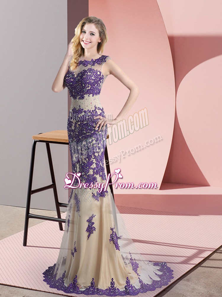Neckline : ScoopShown Color : ChampagneSilhouette : MermaidSleeve Length : sleevelessBack Detail : Side zipperFabric : TulleEmbellishment : Beading,AppliquesOccasion : Prom,PartySeason : Spring,Summer,Fall,Winter