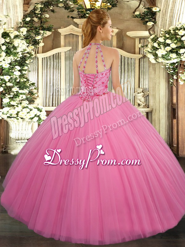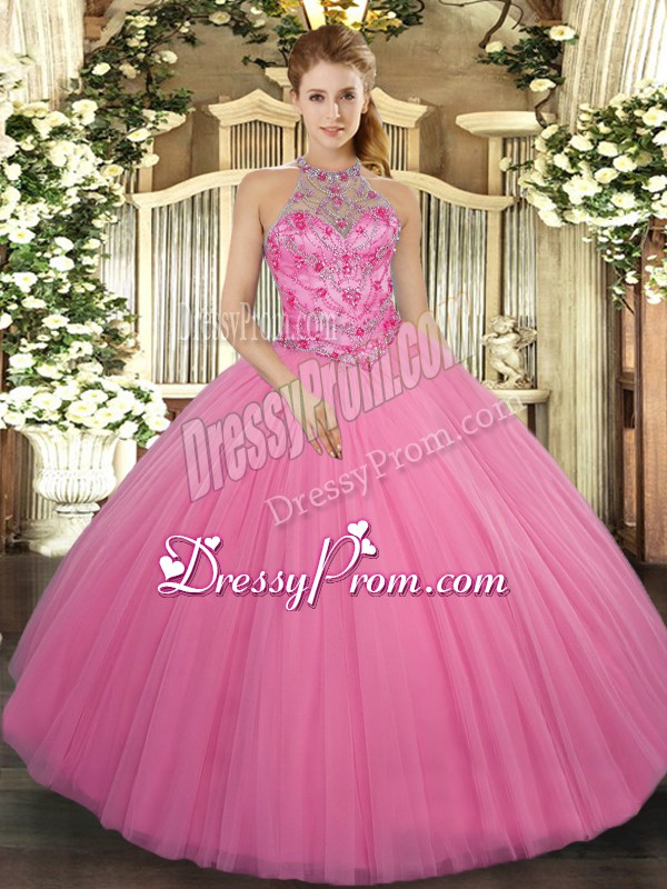 Neckline : Halter topShown Color : Rose Pink Silhouette : Ball GownsSleeve Length : sleevelessHemline : floor lengthBack Detail : Lace upFabric : TulleEmbellishment : BeadingOccasion : Military Ball,Sweet 16,QuinceaneraSeason : Spring,Summer,Fall,Winter