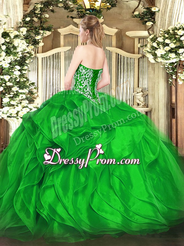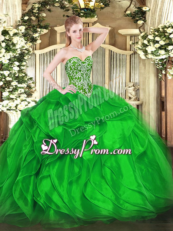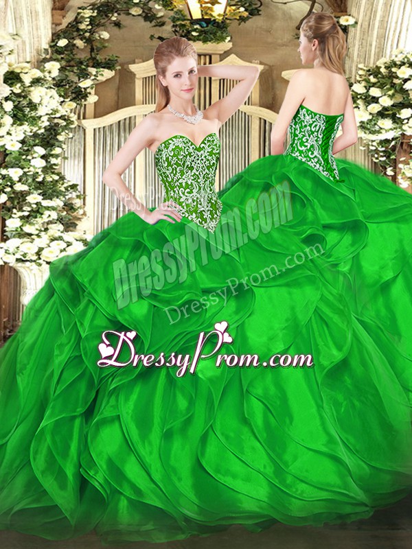 Neckline : SweetheartShown Color : GreenSilhouette : Ball GownsSleeve Length : sleevelessHemline : floor lengthBack Detail : Lace upFabric : OrganzaEmbellishment : Beading,RufflesOccasion : Military Ball,Sweet 16,QuinceaneraSeason : Spring,Summer,Fall,Winter
