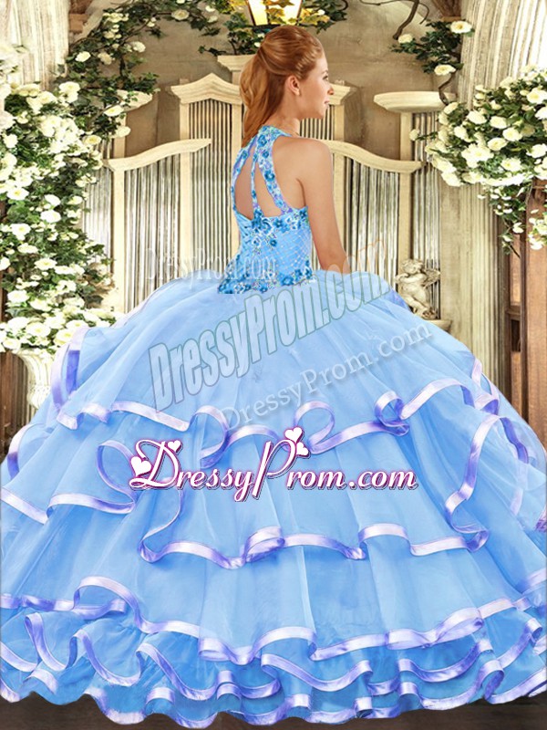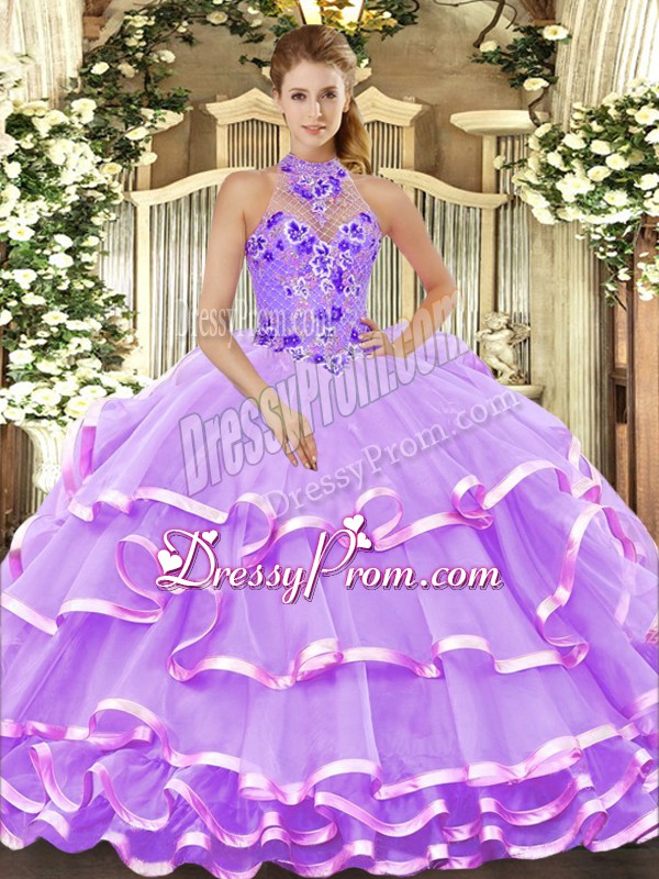 Neckline : Halter topShown Color : LavenderSilhouette : Ball GownsSleeve Length : sleevelessHemline : floor lengthBack Detail : Lace upFabric : OrganzaEmbellishment : Beading,Embroidery,Ruffled LayersOccasion : Military Ball,Sweet 16,QuinceaneraSeason : Spring,Summer,Fall,Winter