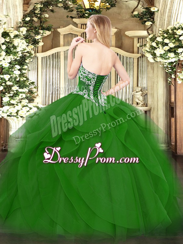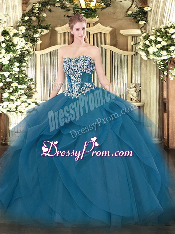 Neckline : StraplessShown Color : Teal Silhouette : Ball GownsSleeve Length : sleevelessHemline : floor lengthBack Detail : Lace upFabric : TulleEmbellishment : Beading,RufflesOccasion : Military Ball,Sweet 16,QuinceaneraSeason : Spring,Summer,Fall,Winter