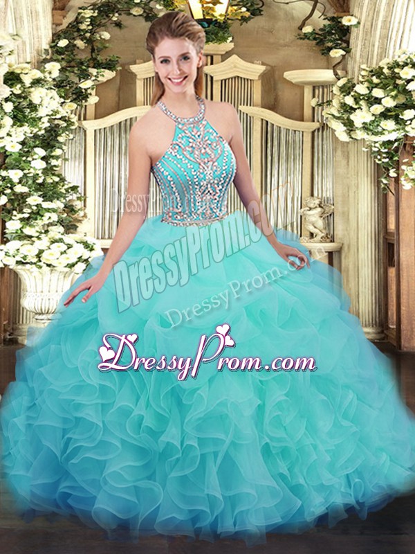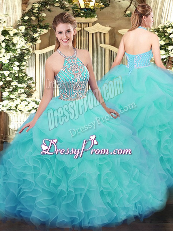 Neckline : Halter top Shown Color : Aqua Blue Silhouette : Ball Gowns Sleeve Length : sleeveless Hemline : floor length Back Detail : Lace up Fabric : Tulle Embellishment : Ruffles Occasion : Military Ball,Sweet 16,Quinceanera Season : Spring,Summer,Fall,Winter