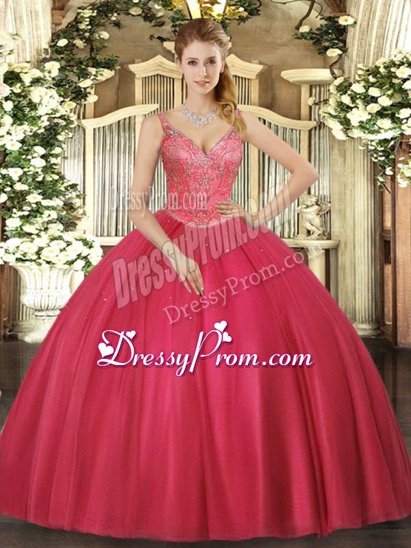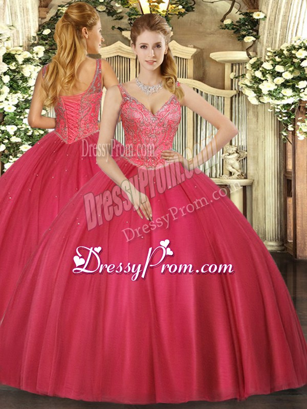 Neckline : V-neckShown Color : RedSilhouette : Ball GownsSleeve Length : sleevelessHemline : floor lengthBack Detail : Lace upFabric : TulleEmbellishment : BeadingOccasion : Military Ball,Sweet 16,QuinceaneraSeason : Spring,Summer,Fall,Winter