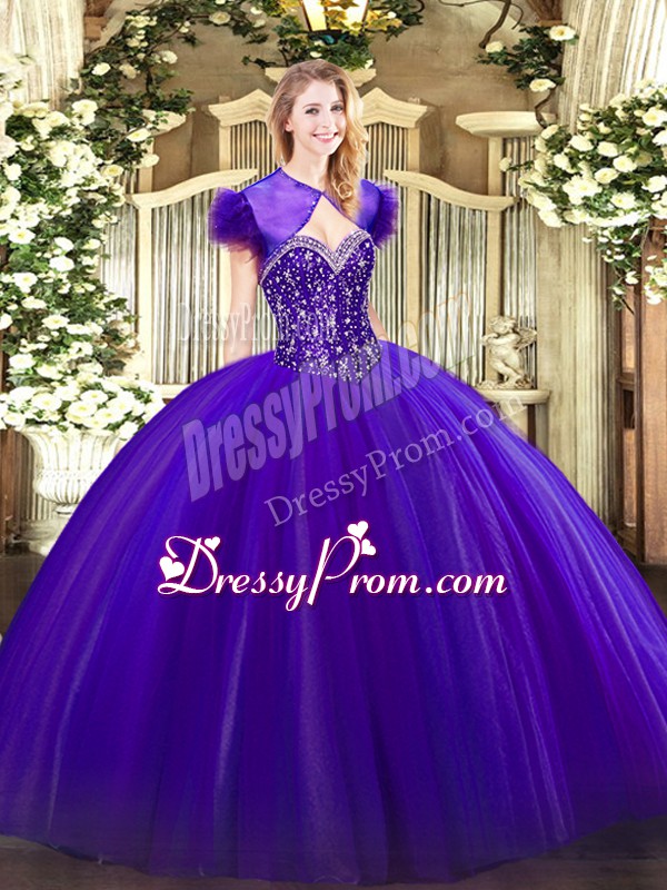 Sleeveless Floor Length Beading Lace Up Sweet 16 Dress with Purple