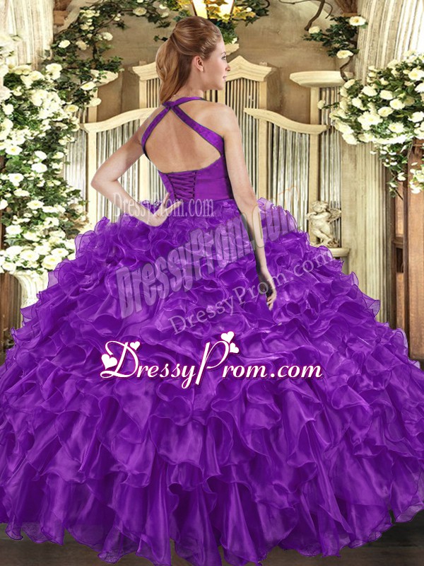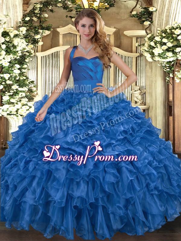 Neckline : Halter topShown Color : BlueSilhouette : Ball GownsSleeve Length : sleevelessHemline : floor lengthBack Detail : Lace upFabric : OrganzaEmbellishment : RufflesOccasion : Military Ball,Sweet 16,QuinceaneraSeason : Spring,Summer,Fall,Winter