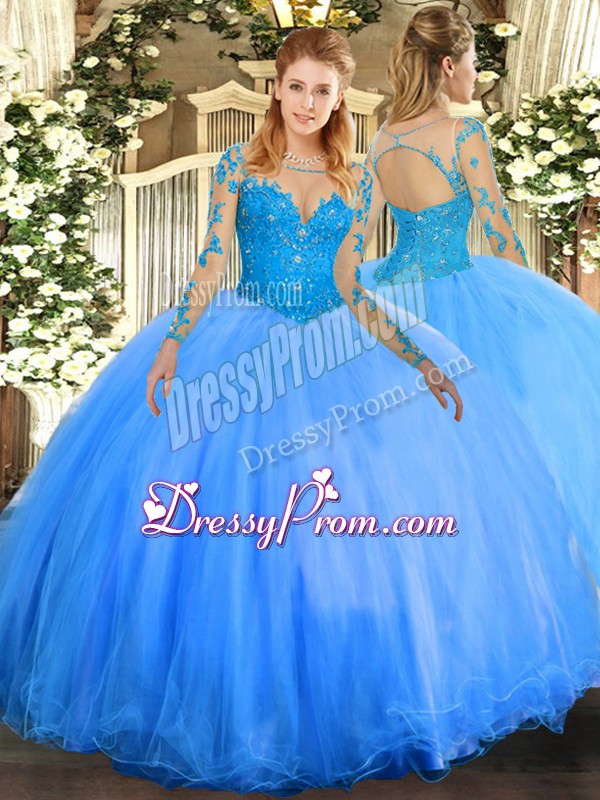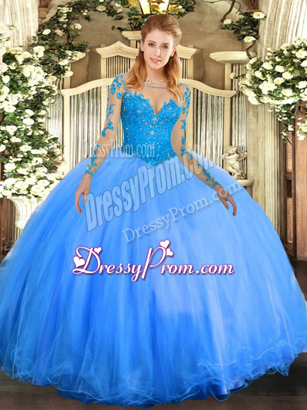 Neckline : ScoopShown Color : Baby BlueSilhouette : Ball GownsSleeve Length : long sleevesHemline : floor lengthBack Detail : Lace upFabric : TulleEmbellishment : LaceOccasion : Military Ball,Sweet 16,QuinceaneraSeason : Spring,Summer,Fall,Winter