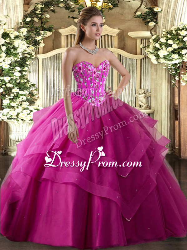 Neckline : SweetheartShown Color : FuchsiaSilhouette : Ball GownsSleeve Length : sleevelessHemline : floor lengthBack Detail : Lace upFabric : TulleEmbellishment : Embroidery,Ruffled LayersOccasion : Military Ball,Sweet 16,QuinceaneraSeason : Spring,Summer,Fall,Winter