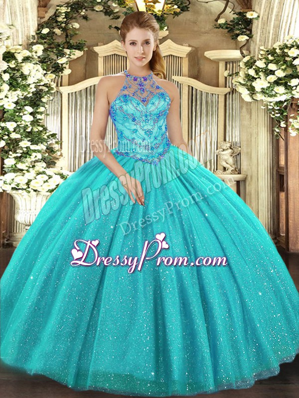 Neckline : Halter top Shown Color : Aqua Blue Silhouette : Ball Gowns Sleeve Length : sleeveless Hemline : floor length Back Detail : Lace up Fabric : Tulle Embellishment : Beading,Embroidery Occasion : Military Ball,Sweet 16,Quinceanera Season : Spring,Summer,Fall,Winter