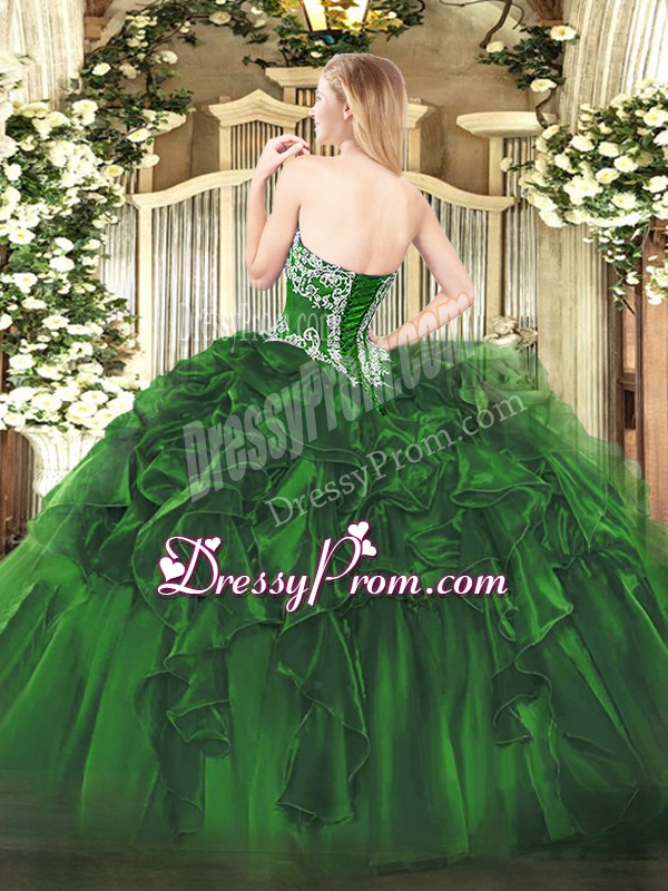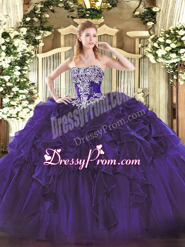 Neckline : StraplessShown Color : PurpleSilhouette : Ball GownsSleeve Length : sleevelessHemline : floor lengthBack Detail : Lace upFabric : OrganzaEmbellishment : Beading,RufflesOccasion : Military Ball,Sweet 16,QuinceaneraSeason : Spring,Summer,Fall,Winter