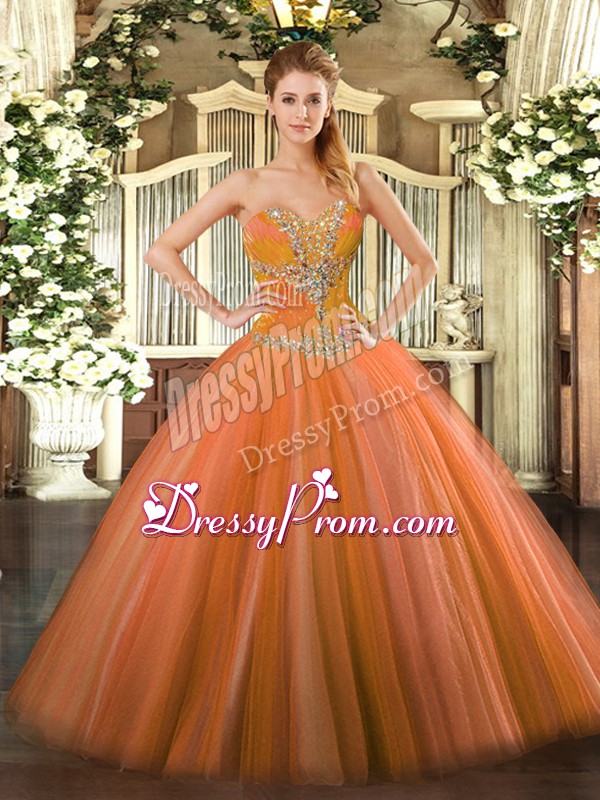 Neckline : SweetheartShown Color : Orange RedSilhouette : Ball GownsSleeve Length : sleevelessHemline : floor lengthBack Detail : Lace upFabric : TulleEmbellishment : BeadingOccasion : Sweet 16,QuinceaneraSeason : Spring,Summer,Fall,Winter