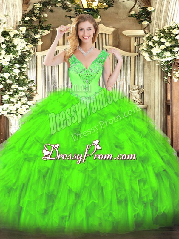 Neckline : V-neckShown Color : Spring GreenSilhouette : Ball GownsSleeve Length : sleevelessHemline : floor lengthBack Detail : Lace upFabric : OrganzaEmbellishment : Beading,RufflesOccasion : Military Ball,Sweet 16,QuinceaneraSeason : Spring,Summer,Fall,Winter