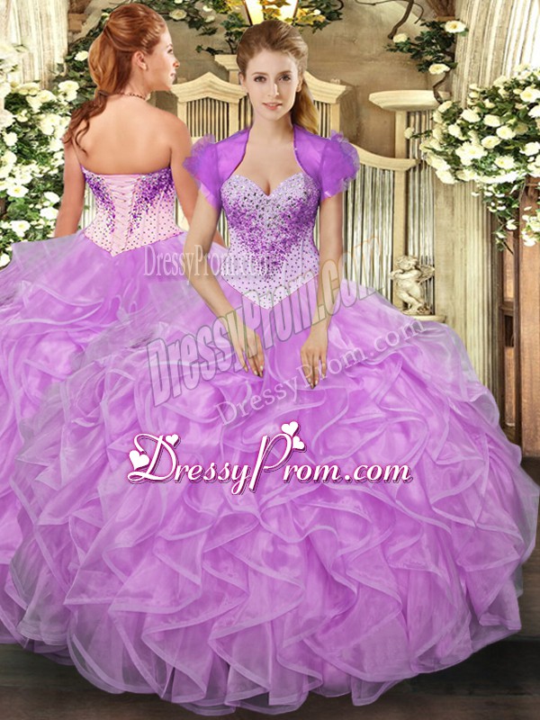 Neckline : SweetheartShown Color : LilacSilhouette : Ball GownsSleeve Length : sleevelessHemline : floor lengthBack Detail : Lace upFabric : OrganzaEmbellishment : Beading,RufflesOccasion : Military Ball,Sweet 16,QuinceaneraSeason : Spring,Summer,Fall,Winter