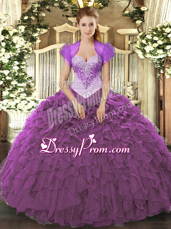 Neckline : SweetheartShown Color : Eggplant PurpleSilhouette : Ball GownsSleeve Length : sleevelessHemline : floor lengthBack Detail : Lace upFabric : OrganzaEmbellishment : Beading,RufflesOccasion : Military Ball,Sweet 16,QuinceaneraSeason : Spring,Summer,Fall,Winter