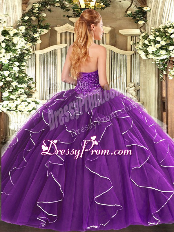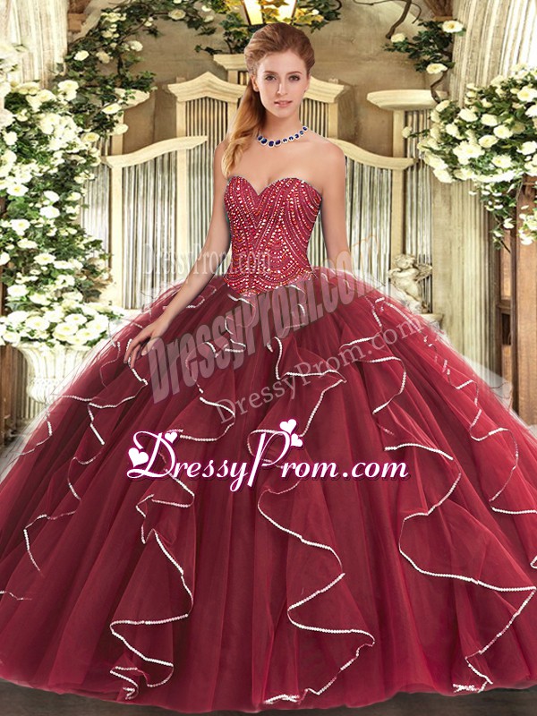 Traditional Floor Length Lace Up Sweet 16 Dresses Burgundy for Military Ball and Sweet 16 and Quinceanera with Beading and Ruffles