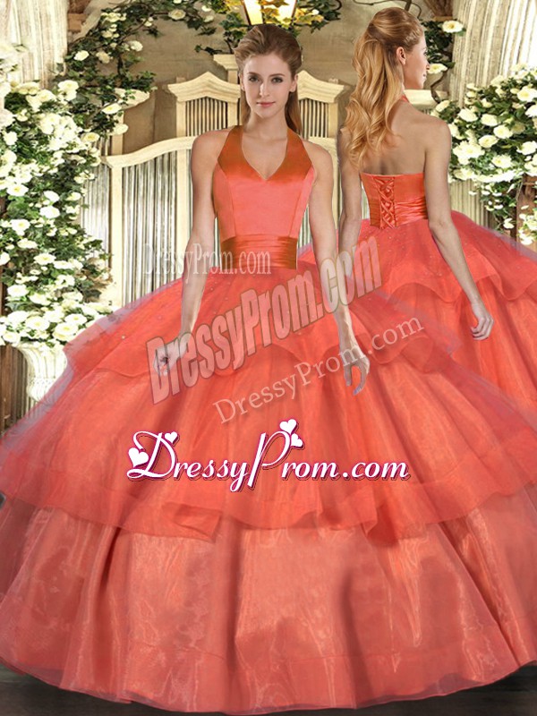Neckline : Halter topShown Color : Orange RedSilhouette : Ball GownsSleeve Length : sleevelessHemline : floor lengthBack Detail : Lace upFabric : TulleEmbellishment : Ruffled LayersOccasion : Military Ball,Sweet 16,QuinceaneraSeason : Spring,Summer,Fall,Winter