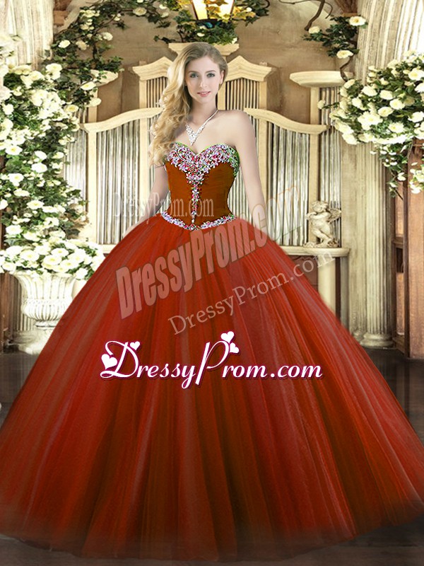 Neckline : SweetheartShown Color : Rust RedSilhouette : Ball GownsSleeve Length : sleevelessHemline : floor lengthBack Detail : Lace upFabric : TulleEmbellishment : BeadingOccasion : Military Ball,Sweet 16,QuinceaneraSeason : Spring,Summer,Fall,Winter