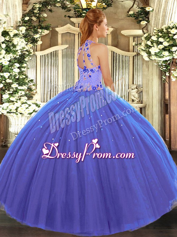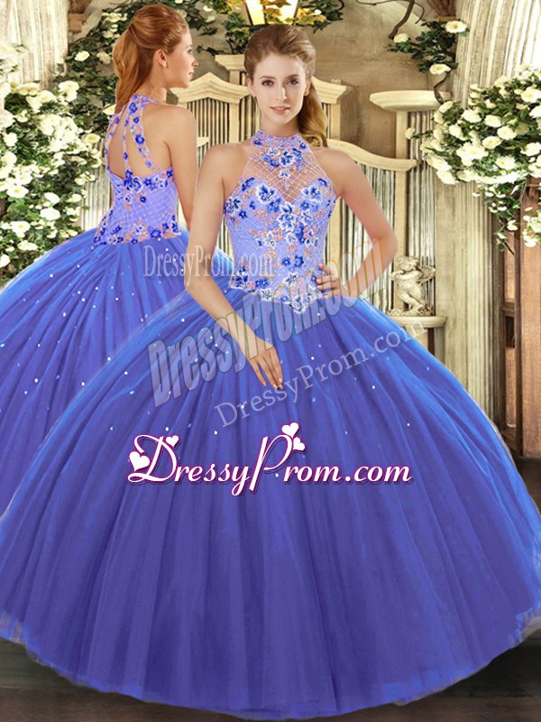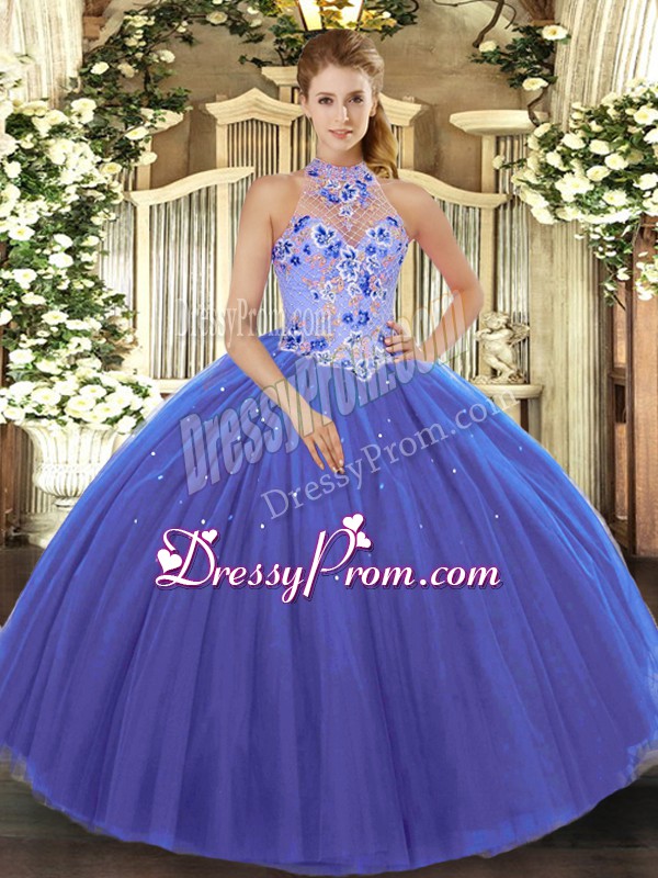 Neckline : Halter topShown Color : BlueSilhouette : Ball GownsSleeve Length : sleevelessHemline : floor lengthBack Detail : Lace upFabric : TulleEmbellishment : EmbroideryOccasion : Military Ball,Sweet 16,QuinceaneraSeason : Spring,Summer,Fall,Winter