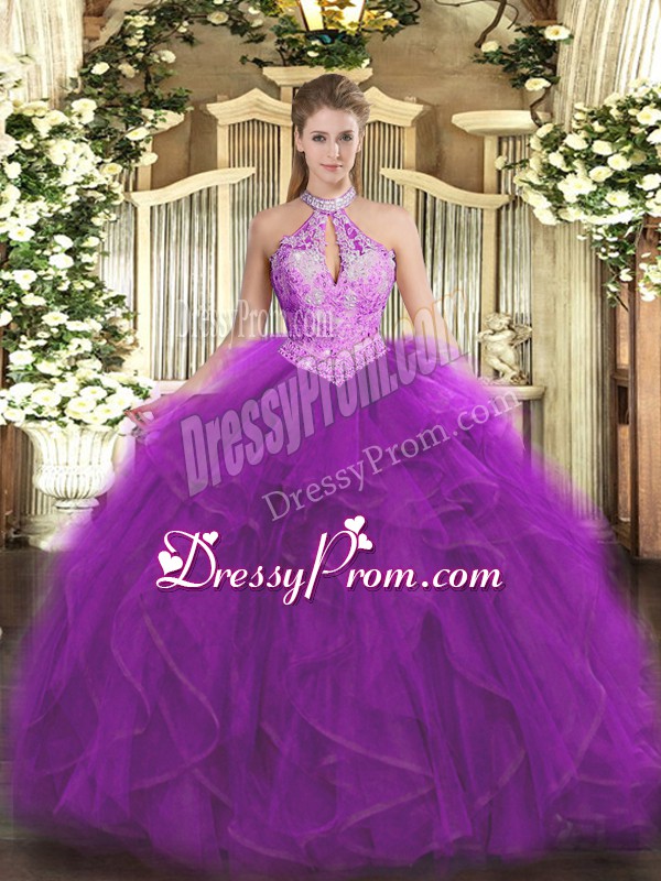 Neckline : Halter topShown Color : PurpleSilhouette : Ball GownsSleeve Length : sleevelessHemline : floor lengthBack Detail : Lace upFabric : OrganzaEmbellishment : Ruffles,SequinsOccasion : Military Ball,Sweet 16,QuinceaneraSeason : Spring,Summer,Fall,Winter