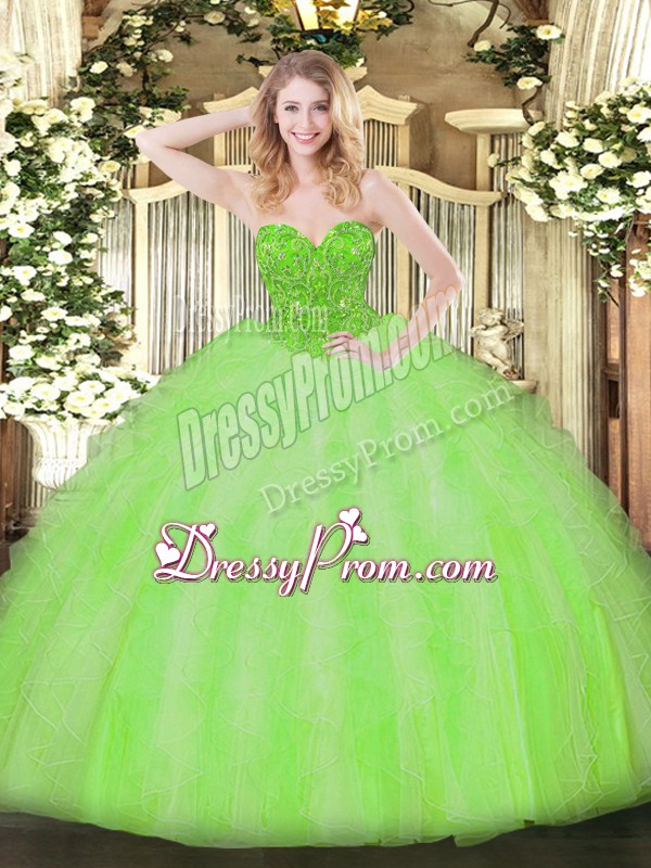 Neckline : V-neckShown Color : Spring GreenSilhouette : Ball GownsSleeve Length : sleevelessHemline : floor lengthBack Detail : Lace upFabric : OrganzaEmbellishment : Beading,RufflesOccasion : Military Ball,Sweet 16,QuinceaneraSeason : Spring,Summer,Fall,Winter