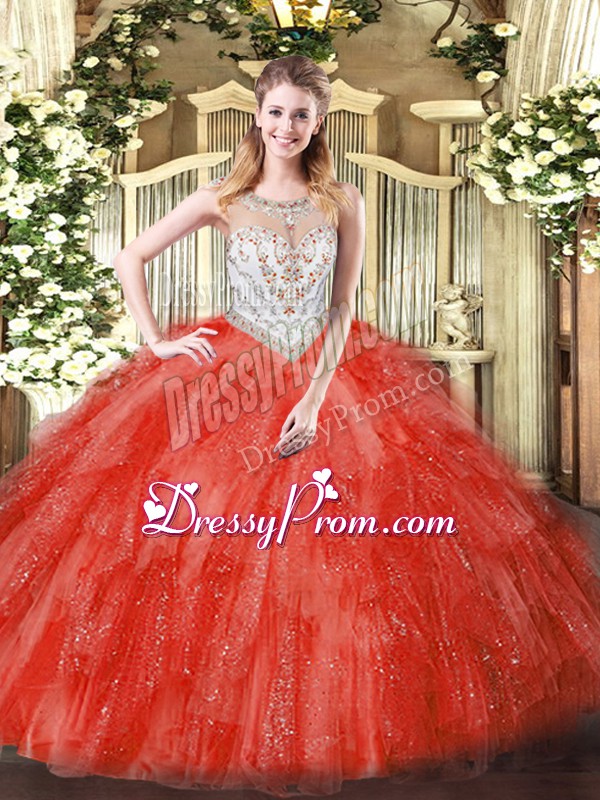 Neckline : ScoopShown Color : Coral RedSilhouette : Ball GownsSleeve Length : sleevelessHemline : floor lengthBack Detail : ZipperFabric : TulleEmbellishment : Beading,RufflesOccasion : Military Ball,Sweet 16,QuinceaneraSeason : Spring,Summer,Fall,Winter