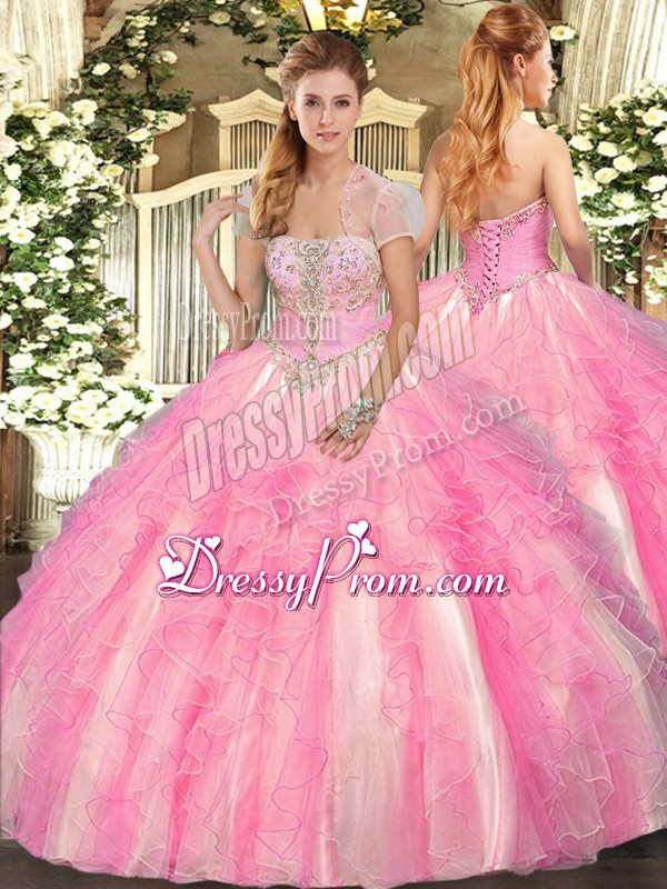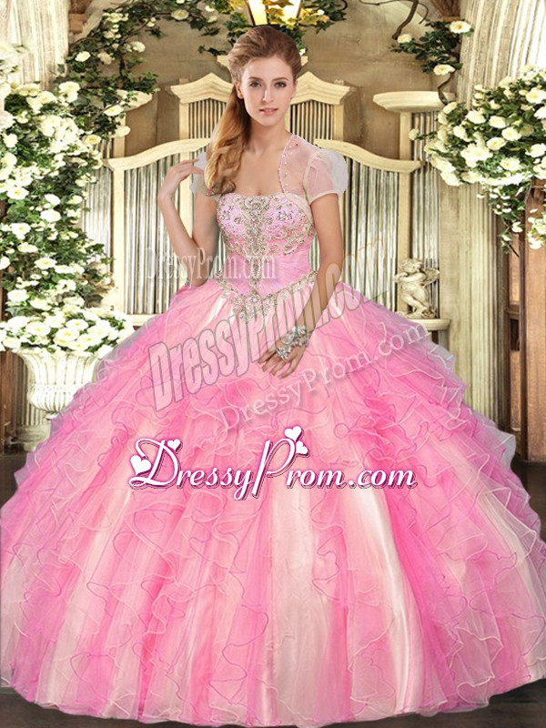 Floor Length Rose Pink Quinceanera Dresses Tulle Sleeveless Appliques and Ruffles