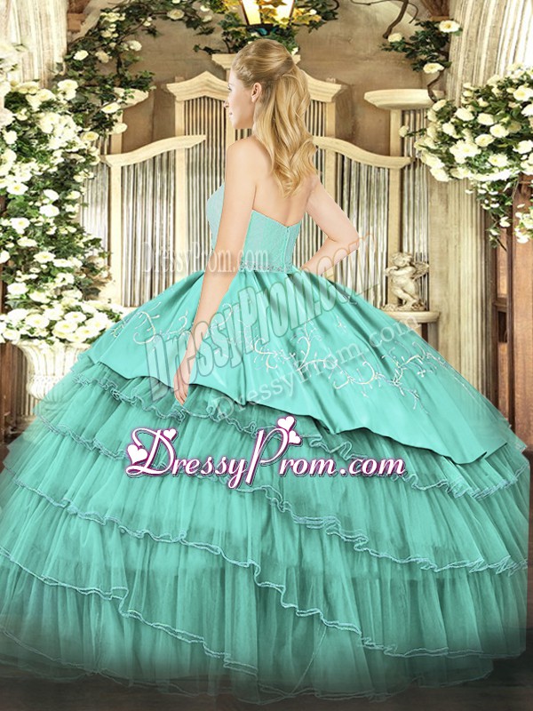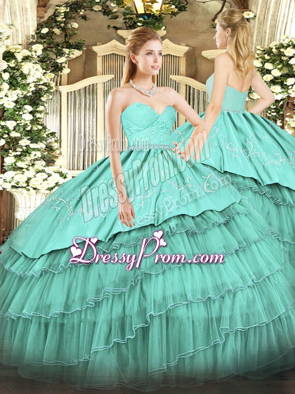 Neckline : SweetheartShown Color : TurquoiseSilhouette : Ball GownsSleeve Length : sleevelessHemline : floor lengthBack Detail : ZipperFabric : Organza,TaffetaEmbellishment : Beading,Lace,Embroidery,Ruffled LayersOccasion : Sweet 16,QuinceaneraSeason : Spring,Summer,Fall,Winter