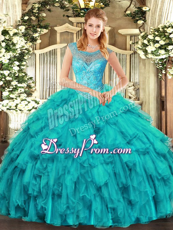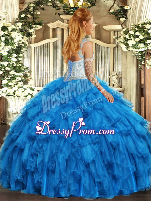 Neckline : ScoopShown Color : Aqua BlueSilhouette : Ball GownsSleeve Length : sleevelessHemline : floor lengthBack Detail : Lace upFabric : OrganzaEmbellishment : Beading,RufflesOccasion : Sweet 16,QuinceaneraSeason : Spring,Summer,Fall,Winter