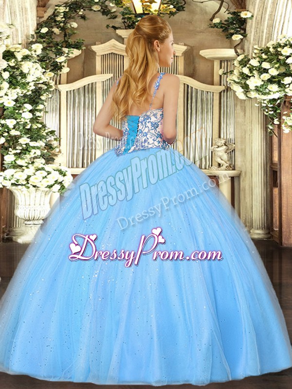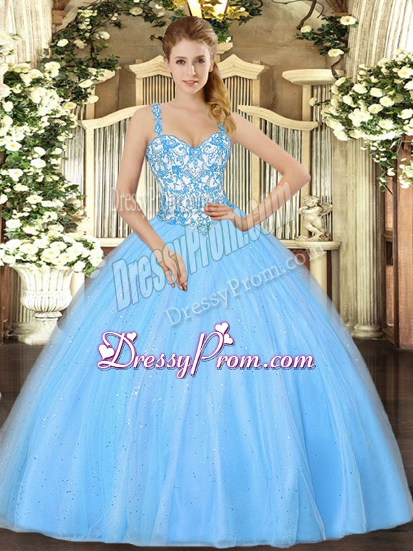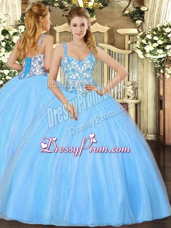 Neckline : StrapsShown Color : Baby BlueSilhouette : Ball GownsSleeve Length : sleevelessHemline : floor lengthBack Detail : Lace upFabric : OrganzaEmbellishment : Beading,AppliquesOccasion : Sweet 16,QuinceaneraSeason : Spring,Summer,Fall,Winter