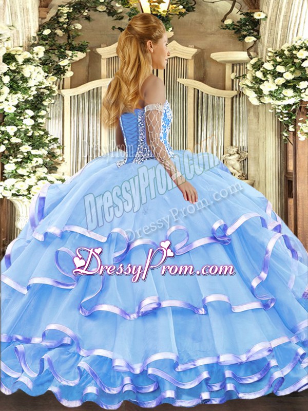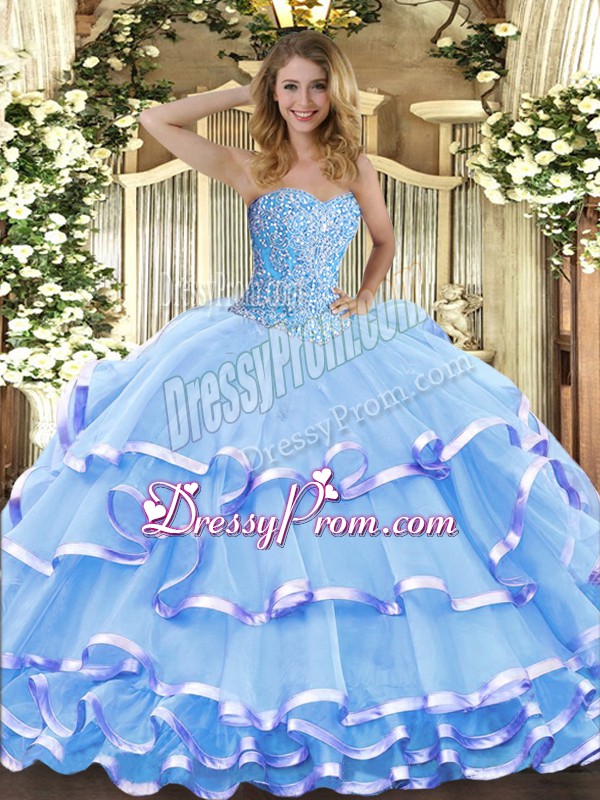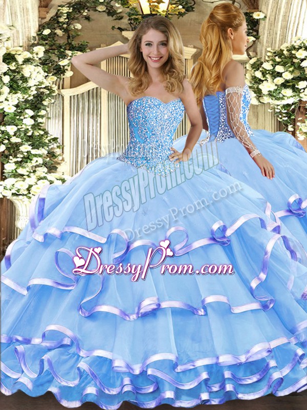 Neckline : SweetheartShown Color : Aqua BlueSilhouette : Ball GownsSleeve Length : sleevelessHemline : floor lengthBack Detail : Lace upFabric : OrganzaEmbellishment : Beading,Ruffled LayersOccasion : Military Ball,Sweet 16,QuinceaneraSeason : Spring,Summer,Fall,Winter