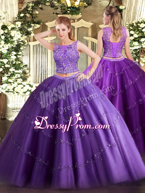 Neckline : ScoopShown Color : PurpleSilhouette : Two PiecesSleeve Length : sleevelessHemline : floor lengthBack Detail : Lace upFabric : TulleEmbellishment : Beading,AppliquesOccasion : Military Ball,Sweet 16,QuinceaneraSeason : Spring,Summer,Fall,Winter