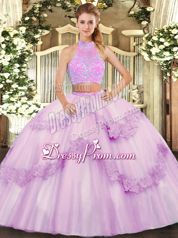 Neckline : SweetheartShown Color : LilacSilhouette : Two PiecesSleeve Length : sleevelessHemline : floor lengthBack Detail : Criss crossFabric : TulleEmbellishment : Beading,Appliques,RufflesOccasion : Military Ball,Sweet 16,QuinceaneraSeason : Spring,Summer,Fall,Winter